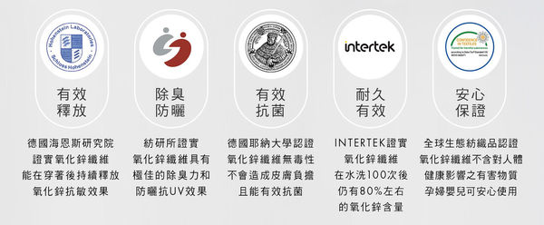 所以,可以耐水洗,經過測試,洗滌100次以上, 仍有原始纖維80%以上之氧化鋅含量。