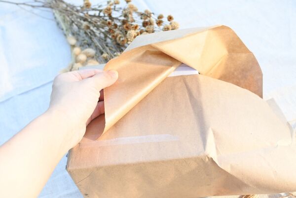打開看見商品時,會看見使用內層包裝紙將商品包覆著並用品牌貼紙黏貼好