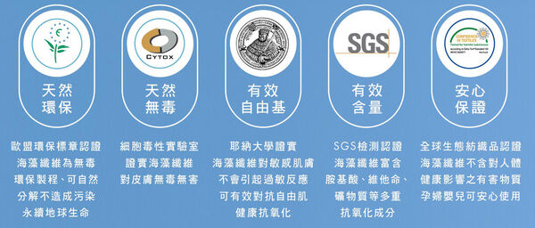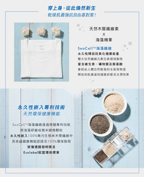 SeaCellTM海藻纖維,具有媲美蠶絲的光滑度及柔膚性; 保濕效果是棉的1.3倍以上,