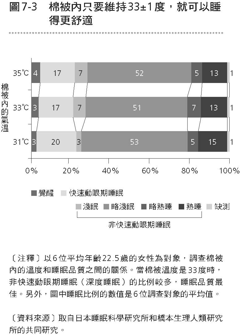 志村課長曾以 6 位平均年齡 22.5 歲的女性為對象,調查她們棉被裡的溫度和睡眠品質之間的關係。結果發現,當溫度是 33 度時,非快速動眼期睡眠(深度睡眠)的比例較多,睡眠品質最佳(見下)