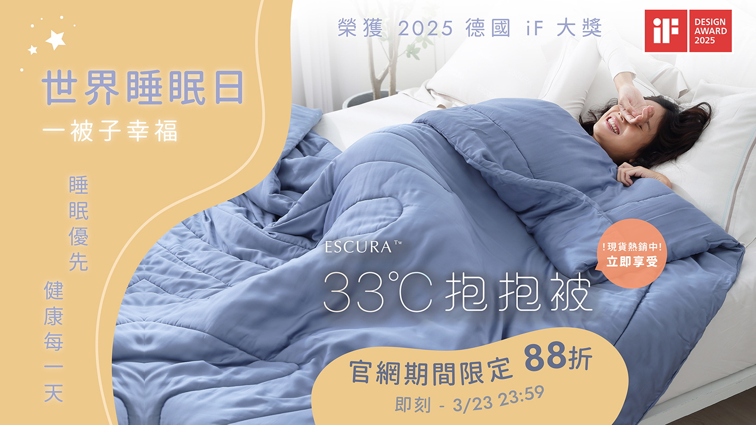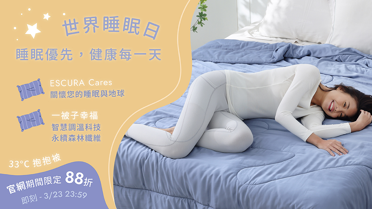 🎉 限時分享幸福時光! 為了呼應「世界睡眠日」活動,我們在 3 月 22 日至 23 日推出會員專屬優惠——抱抱被限時 88 折。如果你也想體驗「一被子的幸福」,別錯過這次機會哦!https://escura.me/world-sleep-day