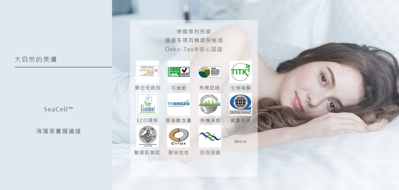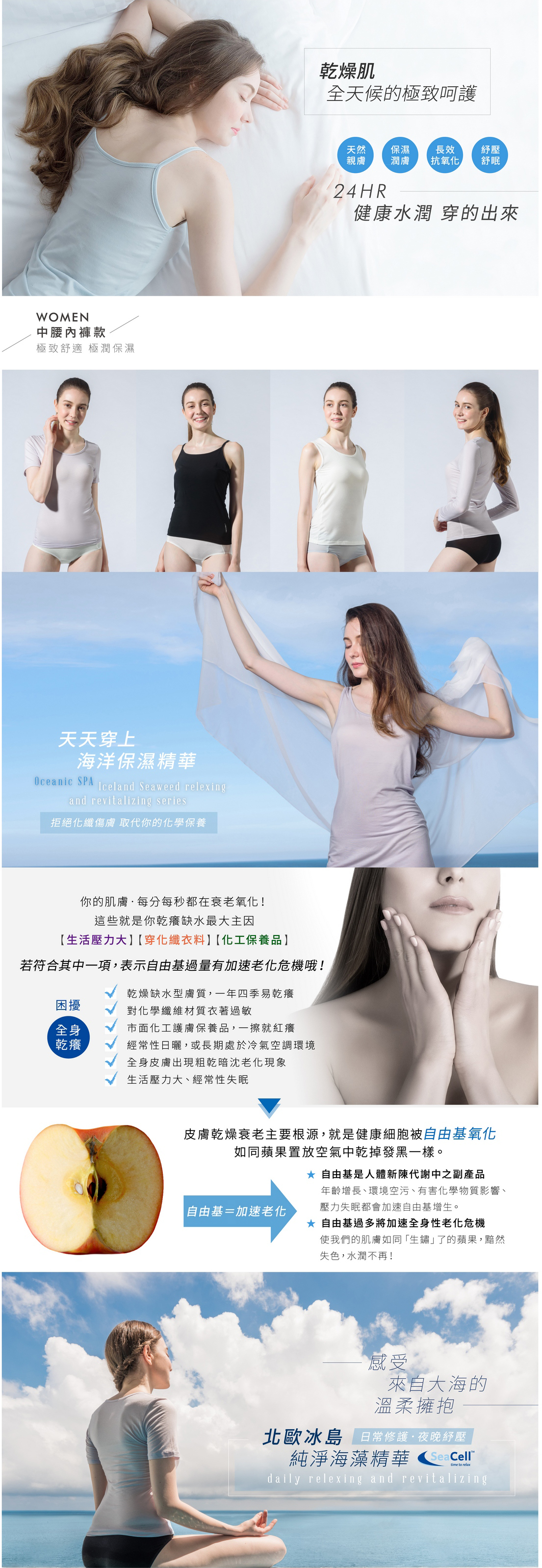 全能抗敏衣系列中的海藻潤膚內著,取自冰島無汙染純淨海域的褐藻與歐洲環保天絲纖維素完美製成 SeaCell™ 海藻纖維,蘊含多重礦物質、胺基酸及維生素等天然護膚精華,可對抗因環境造成的乾燥老化,身體如同穿上一層面膜,維持肌膚水潤、健康光采!