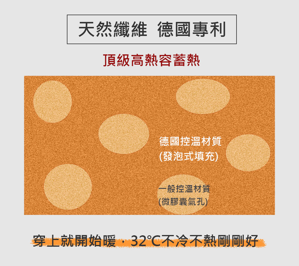 *智慧溫控、穿戴升級→德國專利頂級調溫纖維,利用物理相變原理,自動調節著穿溫度,高倍控溫效果,發熱不悶熱