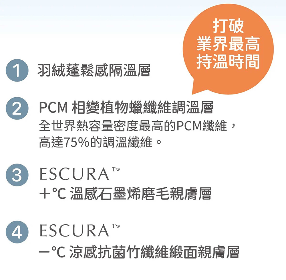 德國專利 PCM 智慧調溫植物纖維,業界最高含量75% PCM 植物調溫纖維,調溫有效率。