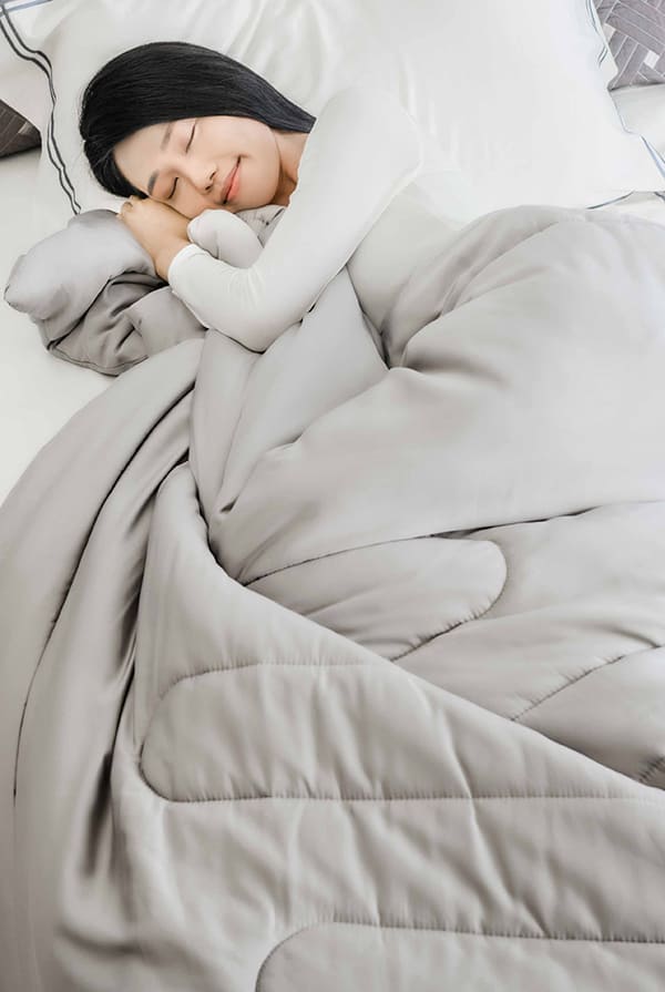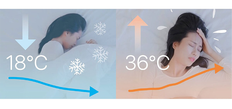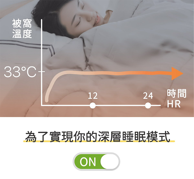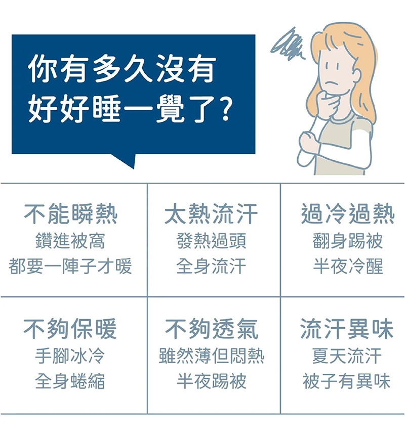 但市面上 95% 以上的被子並沒有調溫的功能,被窩的溫度就會隨著外界的溫度產生變化,明明睡了8小時,卻無法深層睡眠,還是覺得很累。