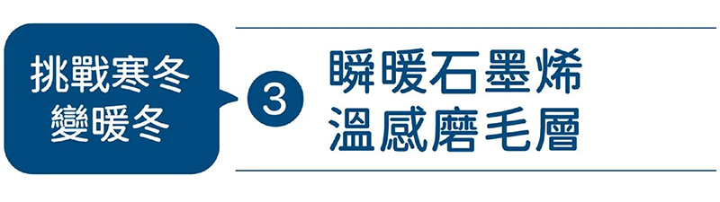 首創結合「石墨烯」與「木漿纖維」,開發了超導親膚的磨毛面料,紅外線瞬熱觸感,滿足第一時間接觸溫度,