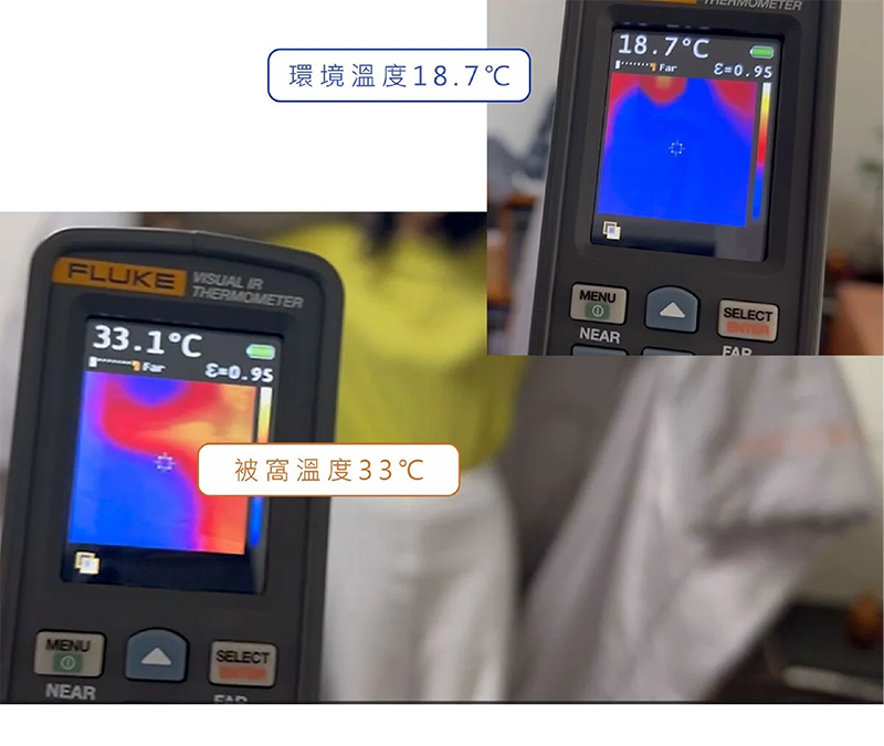 熱像儀實測環境溫度與33℃抱抱被窩溫度差異