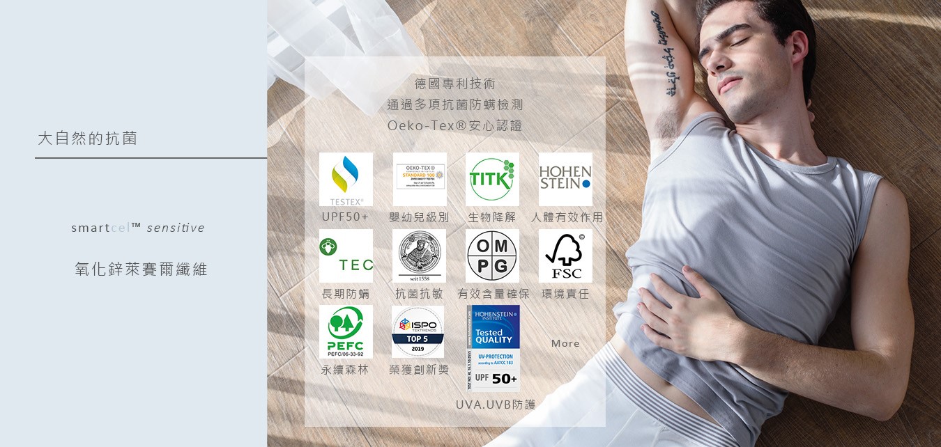 解你身體的癢!異位性皮膚解決方案!全能抗敏衣系列中的抗敏除臭內著衣,原萃自然界鋅礦石結合專利技術,將氧化鋅微米粉末永久嵌入歐洲環保天絲纖維素中,完美製程SmartcelTM sensitive氧化鋅纖維,不僅具長效抗敏、抗菌、除臭、防曬等機能,其細緻親膚觸感,更極致舒適,有效消除汗臭達96%!