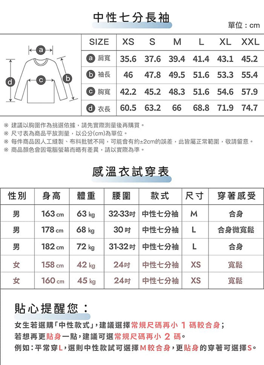 例如:平常穿 ,中性款試可選 M 較合身,更貼身可選