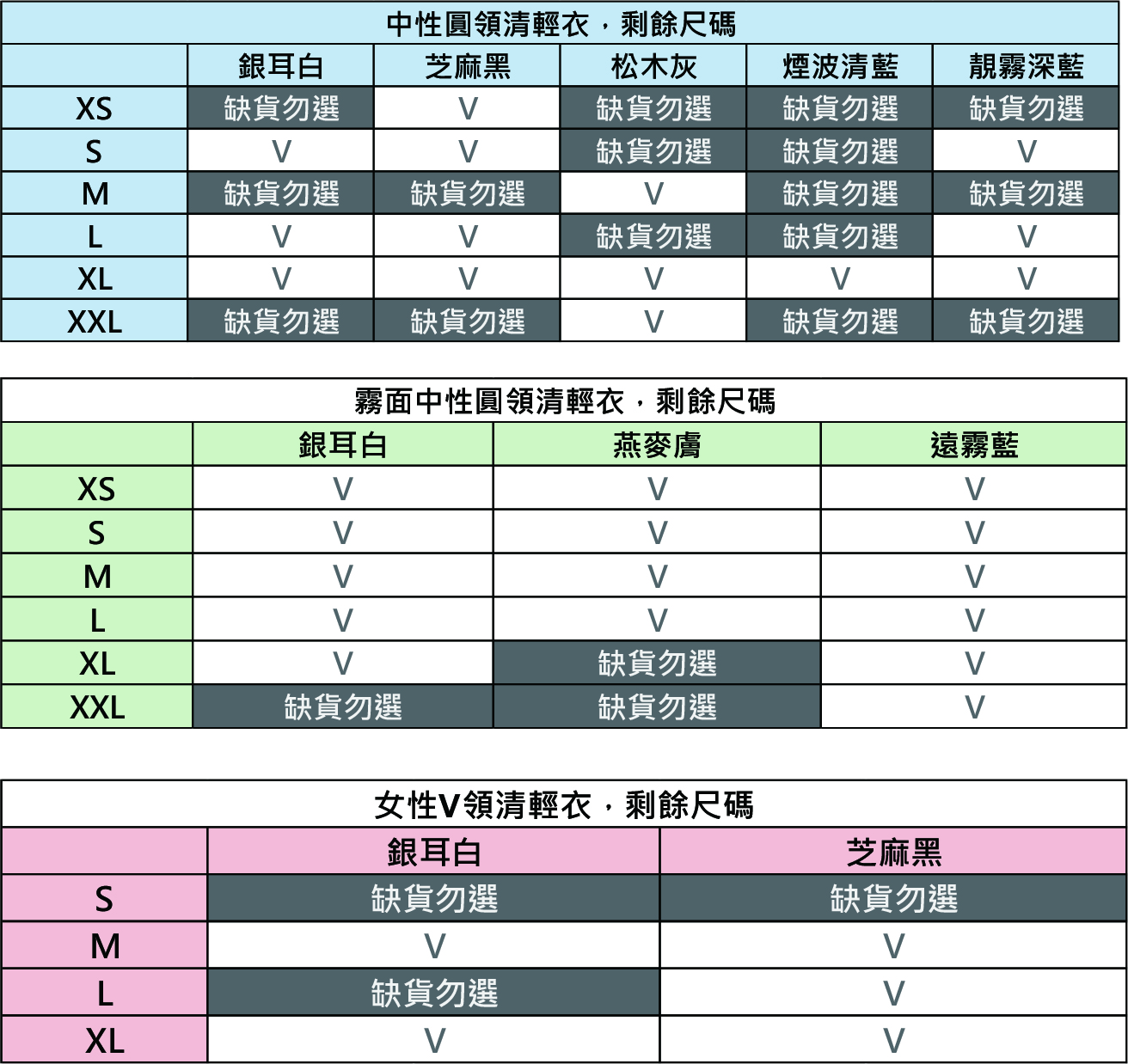 中性圓領:銀耳白 XS/M/XXL、芝麻黑M/XXL、松木灰XS/S/L、煙波清藍XS/S/M/XXL、靓霧深藍M/XXL 已熱銷完售,請勿選!